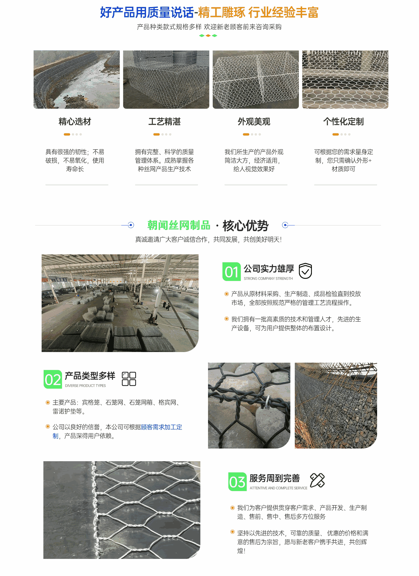 深州市朝聞絲網制品有限公司擁有“中國絲網之鄉”美譽的河北省致力于生產銷售格賓網,雷諾護墊,景觀石籠網,邊坡防護網,綠濱墊,固濱籠的廠家,規格多種多樣?! ∥覐S堅持技術創新、科學管理、誠信經營,注重引進新型生產技術設備,推行標準化生產,采用質量管理體系,從原材料采購、生產管理、產品檢測等關鍵環節嚴格把關,確保了產品質量,贏得了客戶的信賴。我公司秉承“誠信、務實、高效”的企業宗旨,真誠希望與世界各地客戶互惠互利,共創美好未來!多年來"以誠立廠","以質興業"。 憑借過硬的質量、良好的信譽、優質的服務、合理的價格不斷拓展市場,誠摯的希望在平等互利,坦誠相待的基礎上與國內外客戶長期合作!...